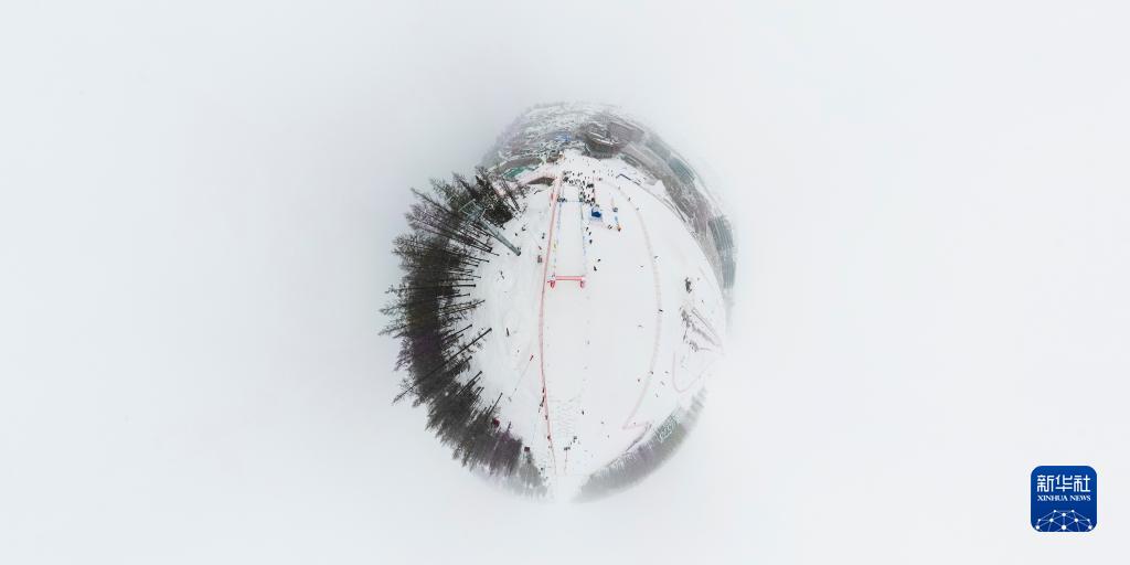 新疆富蘊縣可可托海國際滑雪度假區(4月8日攝,無(wú)人機全景照片)。