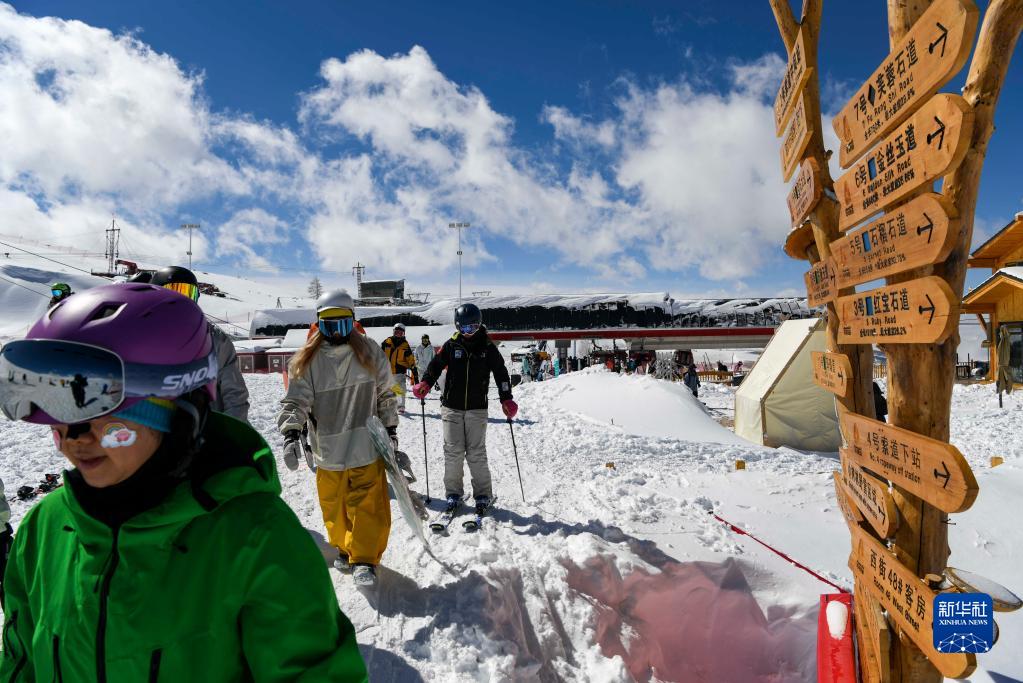 游客在新疆富蘊縣可可托海國際滑雪度假區滑雪游玩(4月9日攝)。