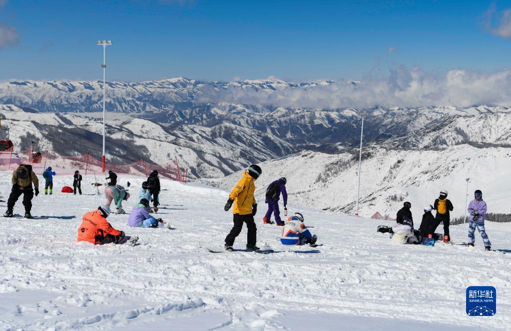 游客在新疆富蘊縣可可托海國際滑雪度假區滑雪游玩(4月9日攝)。