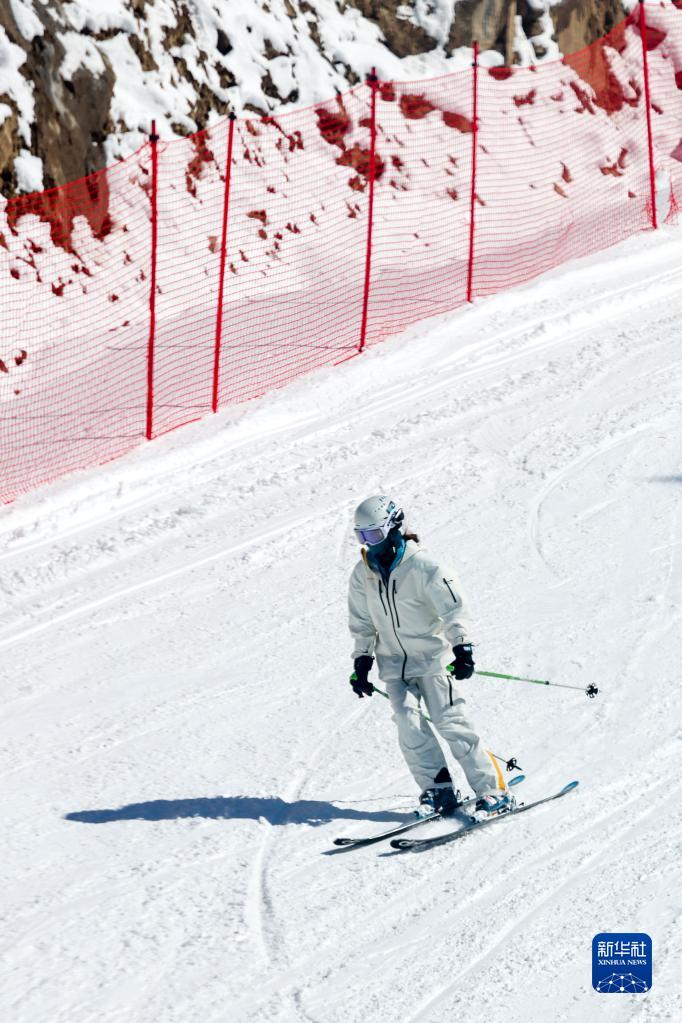 游客在新疆富蘊縣可可托海國際滑雪度假區滑雪游玩(4月9日攝)。