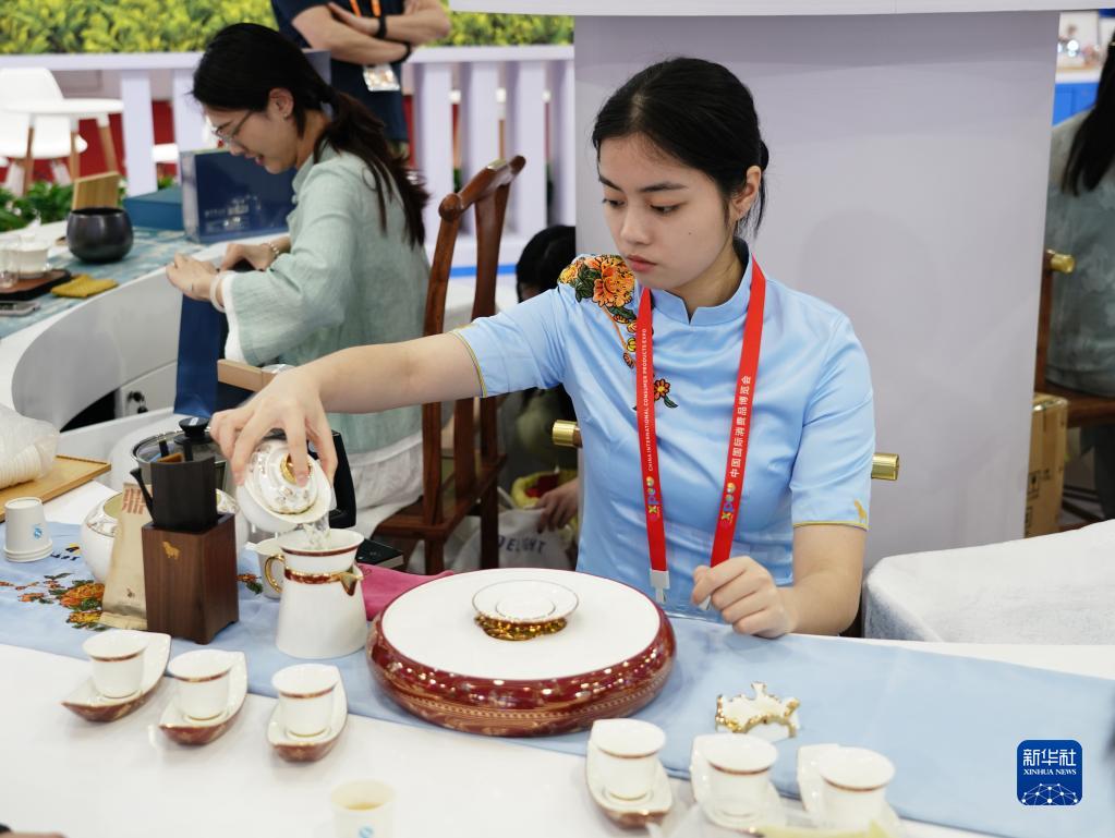 4月10日,消博會(huì )福建展臺的工作人員在為參觀(guān)者沏茶。