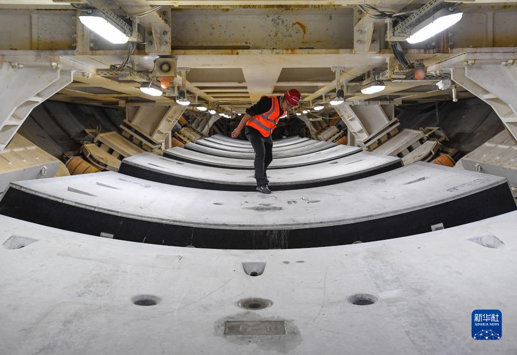 在深江鐵路珠江口隧道廣州南沙段,中鐵隧道局管理人員在“大灣區號”盾構機底部檢查管片拼裝施工(4月10日攝)。