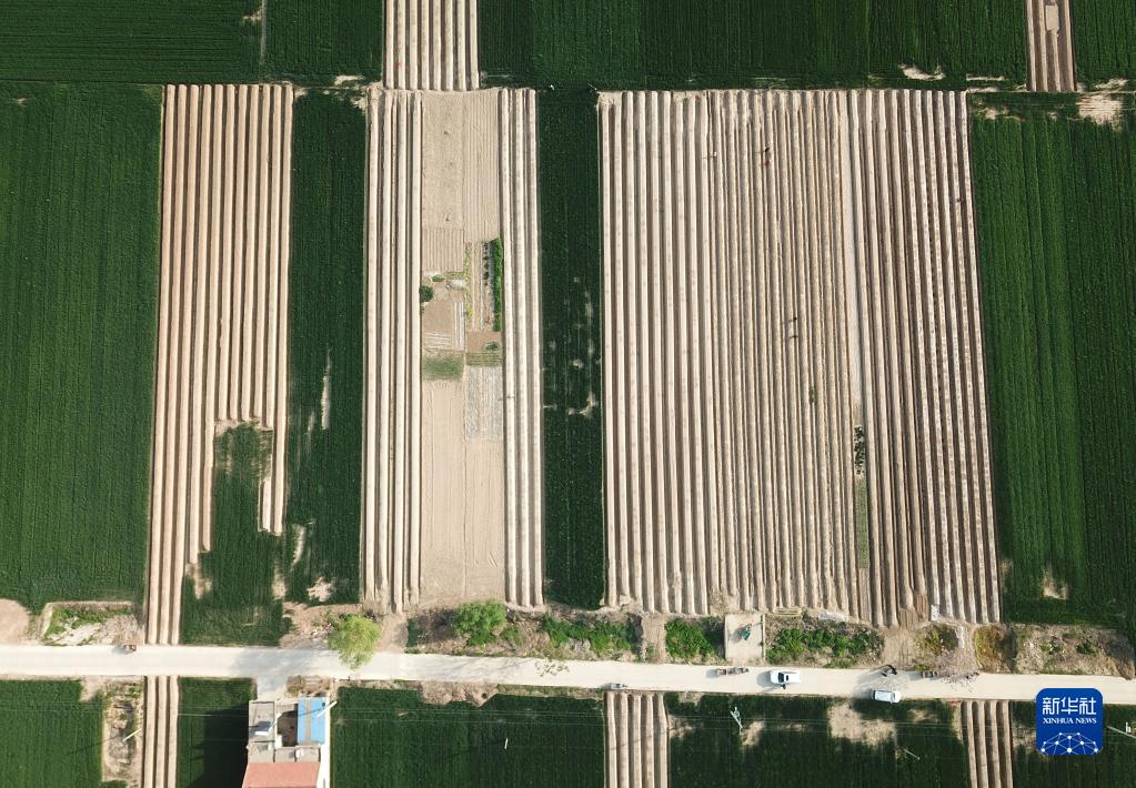 4月10日,在山東省單縣高老家鄉,村民在蘆筍種植田收獲蘆筍(無(wú)人機照片)。