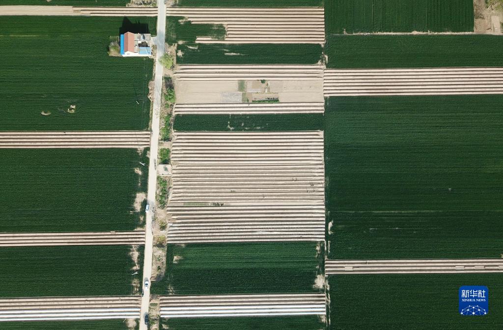 4月10日,在山東省單縣高老家鄉,村民在蘆筍種植田收獲蘆筍(無(wú)人機照片)。