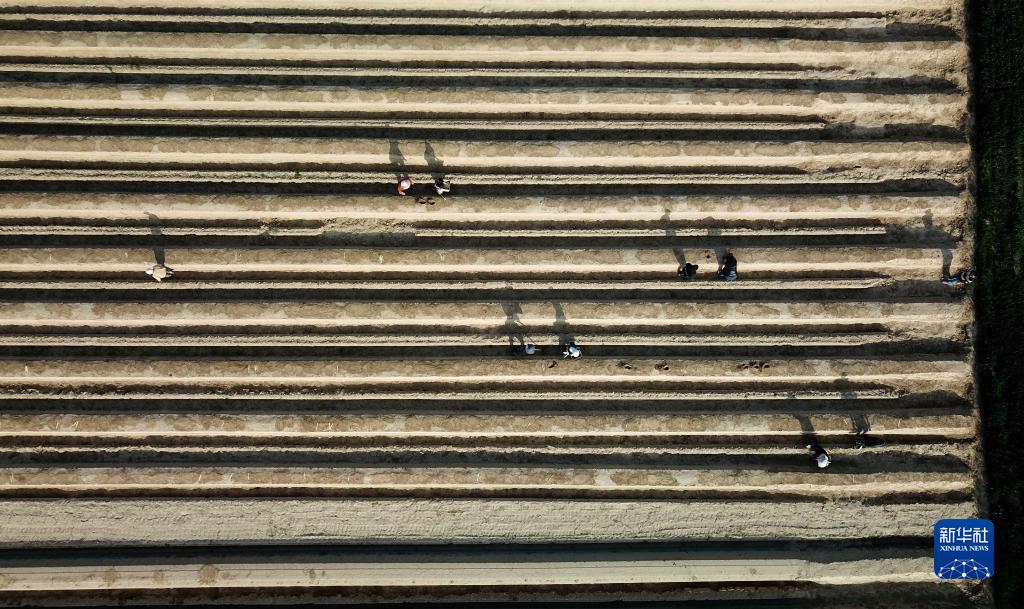 4月10日,在山東省單縣高老家鄉,村民在蘆筍種植田收獲蘆筍(無(wú)人機照片)。