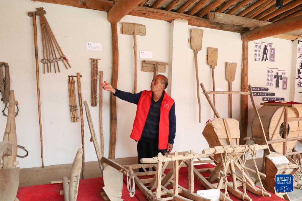 4月10日,蘭州市皋蘭縣什川古梨園農耕文化展示館工作人員為游客介紹傳統農具。