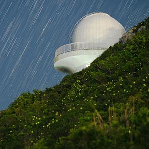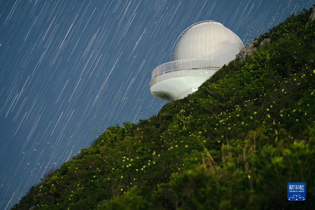 位于西涌社區的深圳市天文臺以及螢火蟲(chóng)與星空(堆棧照片,2021年7月7日攝)。