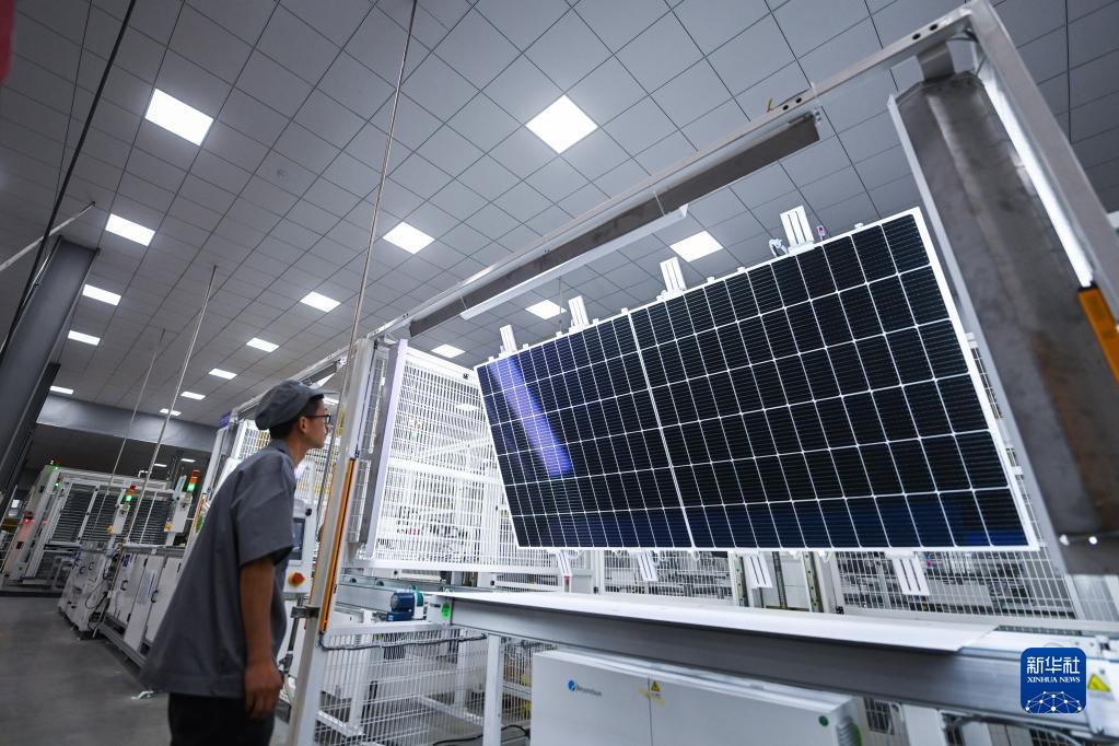 4月11日,在位于湖州吳興區織里鎮的浙江貝盛綠能科技有限公司的車(chē)間內,自動(dòng)化流水線(xiàn)在加緊生產(chǎn)出口歐洲的光伏組件。