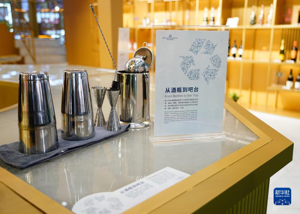 這是保樂(lè )力加中國展臺展示的由廢棄空酒瓶制作的循環(huán)再生吧臺(4月10日攝)。