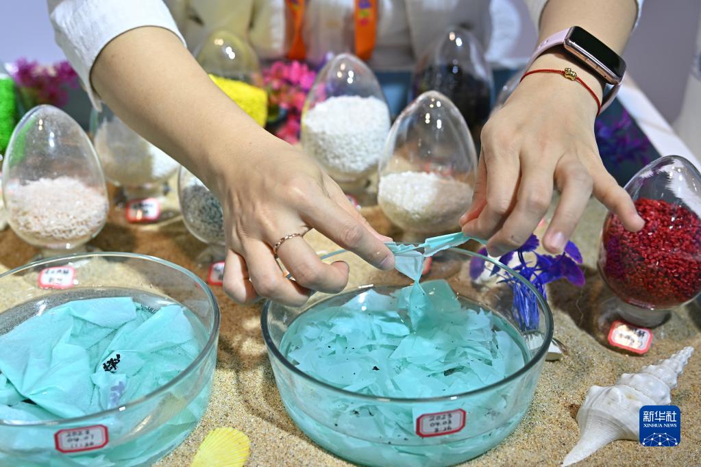 4月11日,消博會(huì )海南展臺的工作人員介紹并展示快速降解材料。