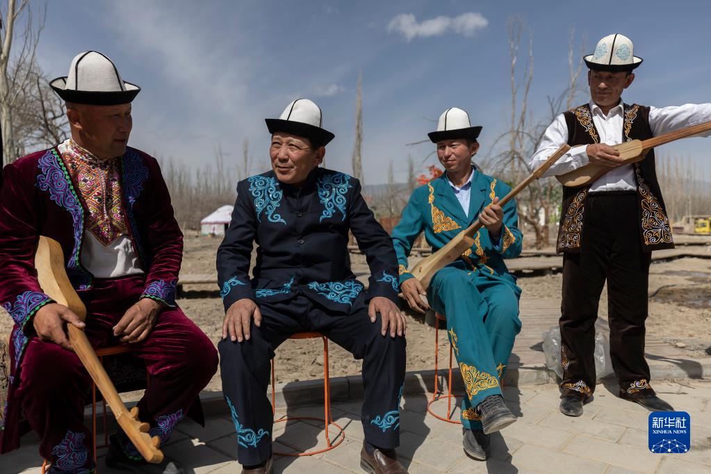4月10日,在別迭里村,阿不都別克(左二)在等待上場(chǎng)時(shí)與民間藝人交談。