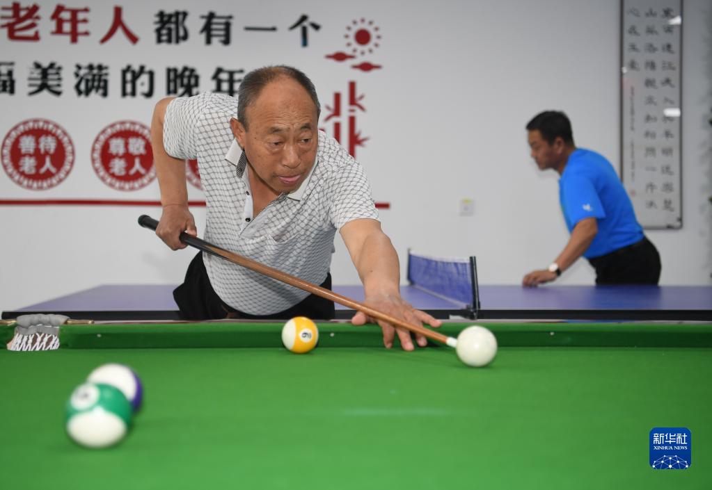 老年人在河北雄安新區容西第一養老驛站打臺球(4月10日攝)。