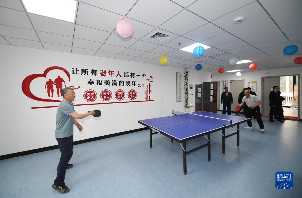 老年人在河北雄安新區容西第一養老驛站打乒乓球(4月10日攝)。