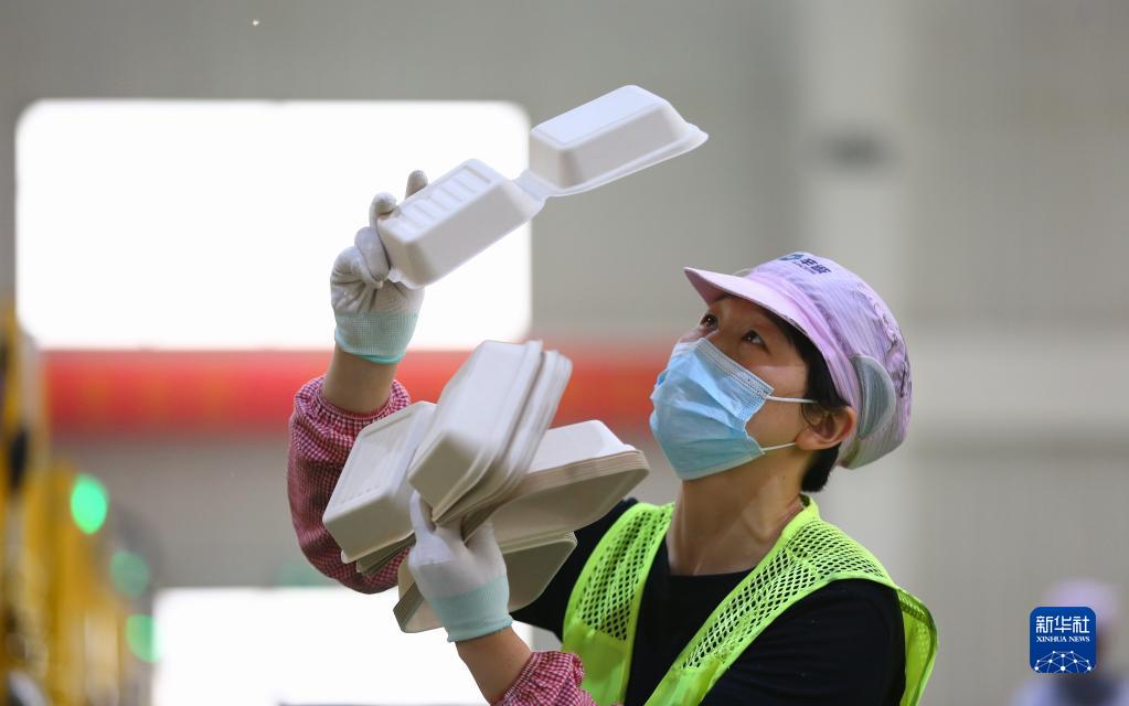 4月11日,在位于山東省滕州市西崗鎮的一家企業(yè),工人對以秸稈為原料生產(chǎn)的可降解餐盒質(zhì)量進(jìn)行初檢。