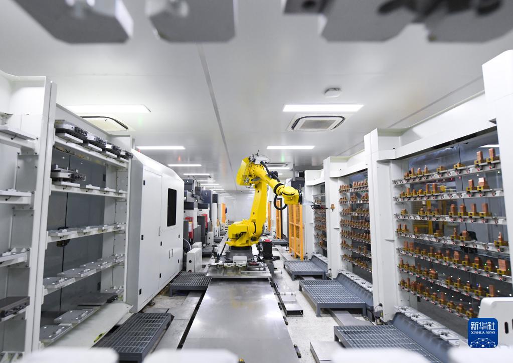 4月11日,在位于余姚的寧波勞仕塑業(yè)科技有限公司,機器人在模具數字智能化工廠(chǎng)加工模具零件。