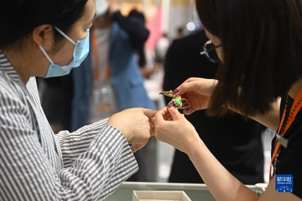 4月11日,在消博會(huì )意大利企業(yè)館,工作人員(右)向觀(guān)眾介紹來(lái)自意大利的珠寶產(chǎn)品。