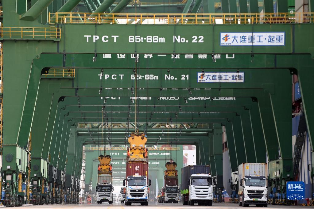 4月11日,卡車(chē)在天津港太平洋國際集裝箱碼頭運輸集裝箱。