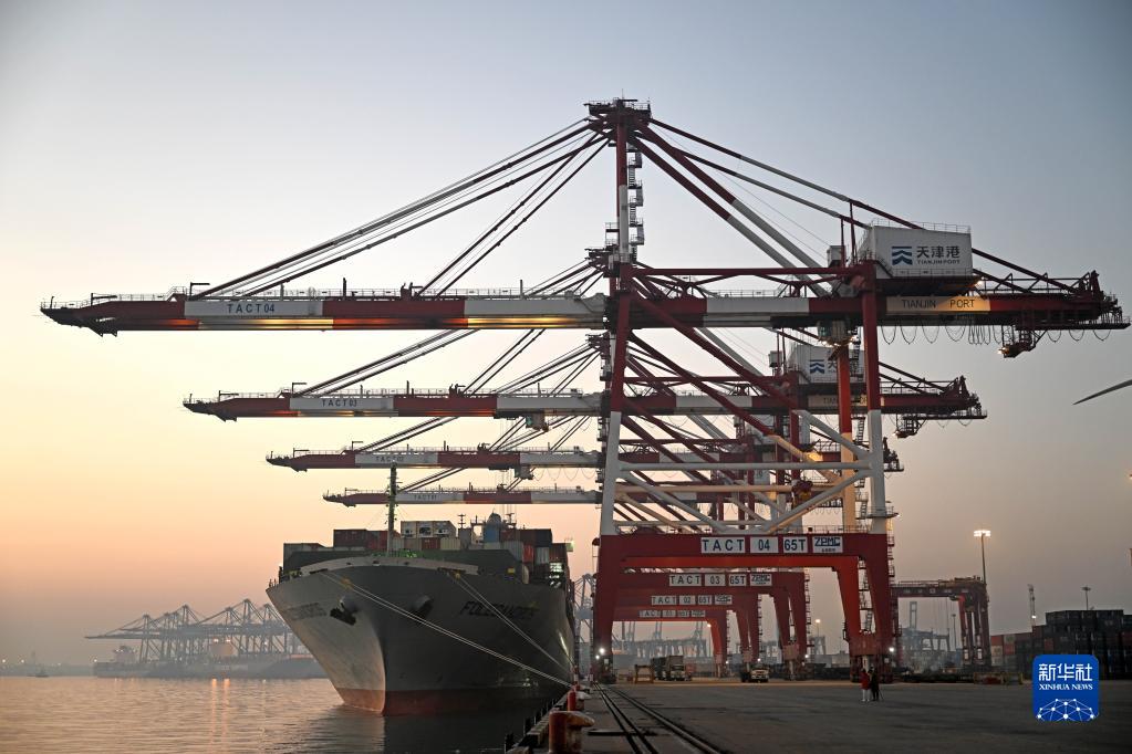 一艘貨輪靠泊在天津港聯(lián)盟國際集裝箱碼頭進(jìn)行裝卸作業(yè)(1月1日攝)。