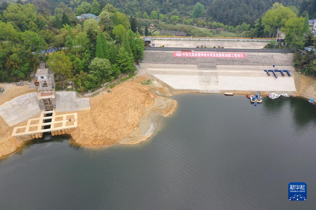 4月11日拍攝的加固工程主體完工后的阿哈水庫大壩(無(wú)人機照片)。
