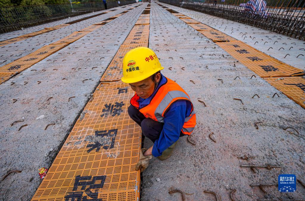 梁開(kāi)高速梁平段柏樹(shù)橋橋面施工隊工人蔡道慶對橋梁濕接縫進(jìn)行踏板安全防護(2023年3月20日攝)。