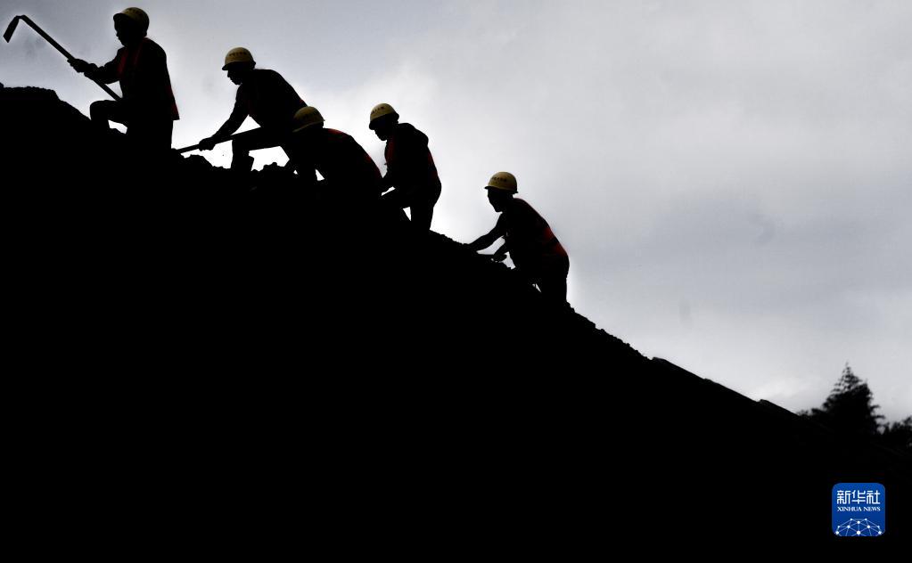 在梁開(kāi)高速梁平段施工現場(chǎng),工人在修筑邊坡(2023年3月20日攝)。