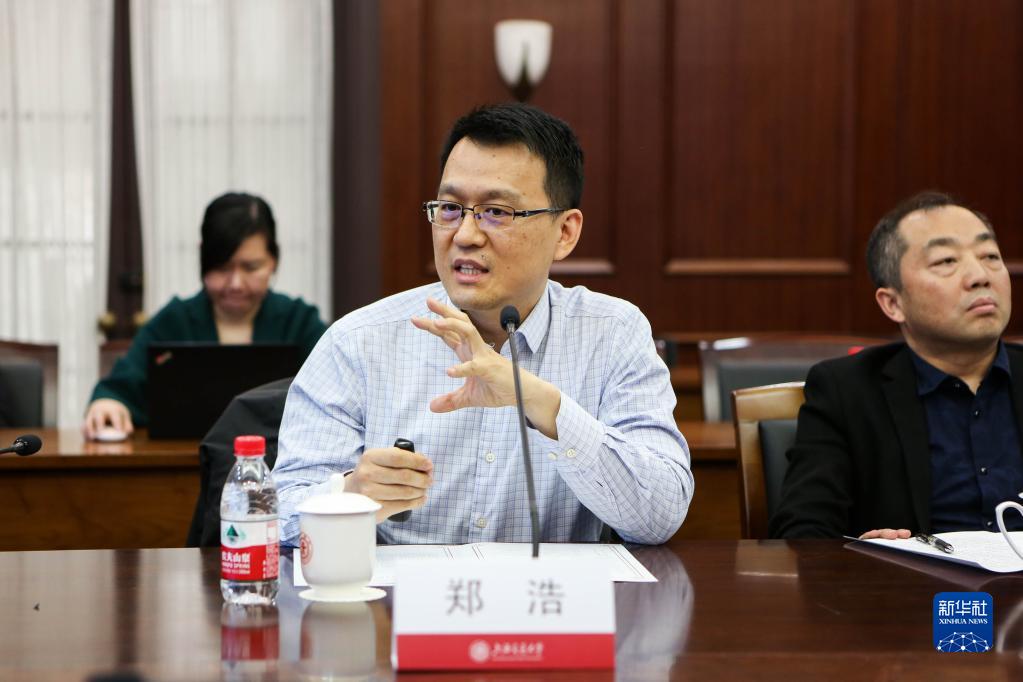 4月12日,上海交通大學(xué)物理與天文學(xué)院教授鄭浩(前排左一)介紹“實(shí)驗證實(shí)超導態(tài)‘分段費米面’”成果。