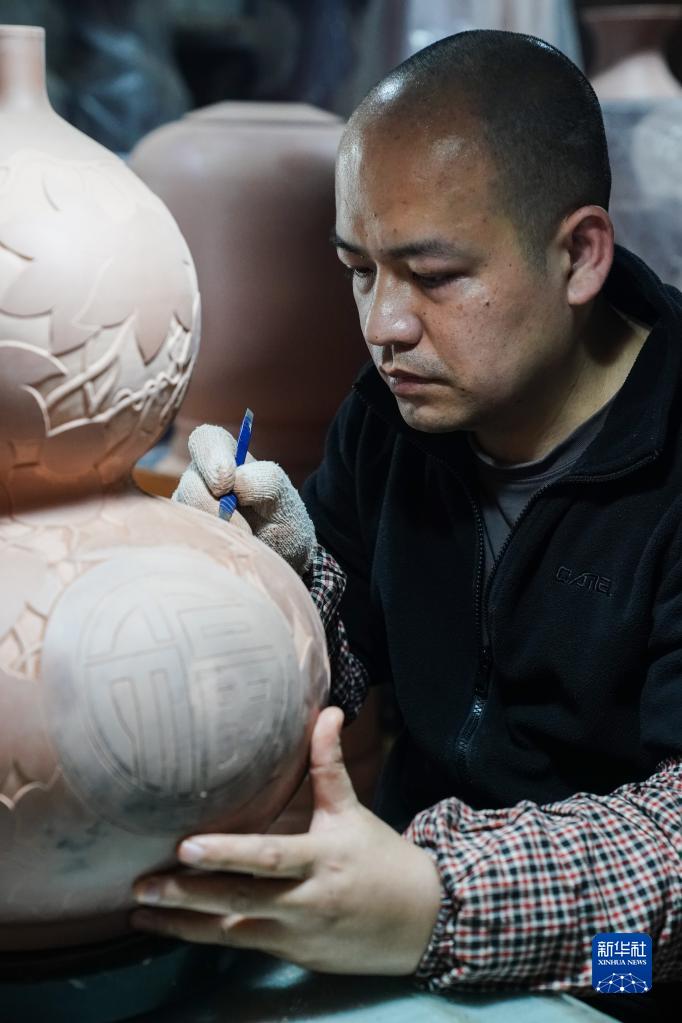 4月11日,在廣西欽州市,員工在坭興陶生產(chǎn)車(chē)間進(jìn)行雕刻工作。