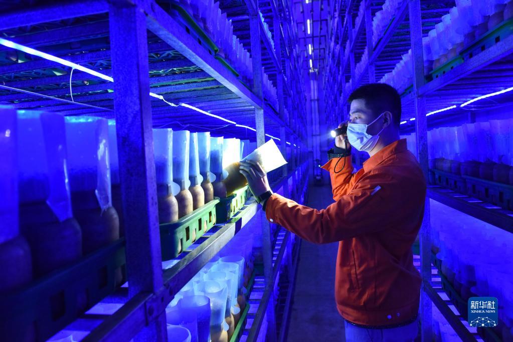4月13日,河北省臨西縣一家食用菌生產(chǎn)企業(yè)的員工在菌菇培育車(chē)間查看金針菇的生長(cháng)情況。