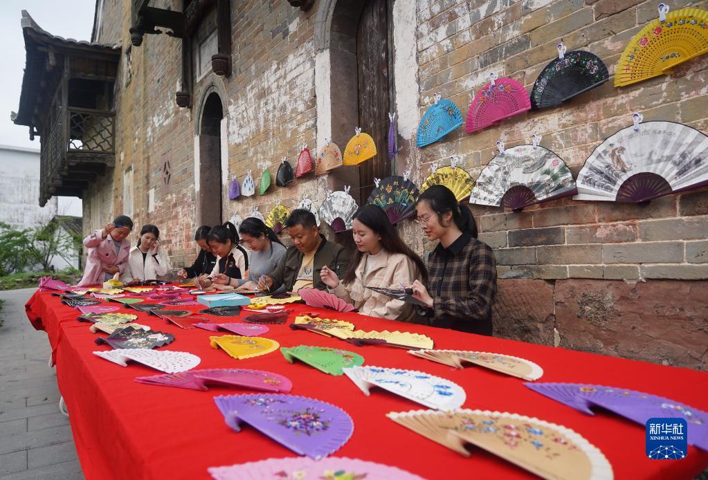4月12日,在江西省廣昌縣甘竹鎮羅家村,村民在繪制工藝扇。