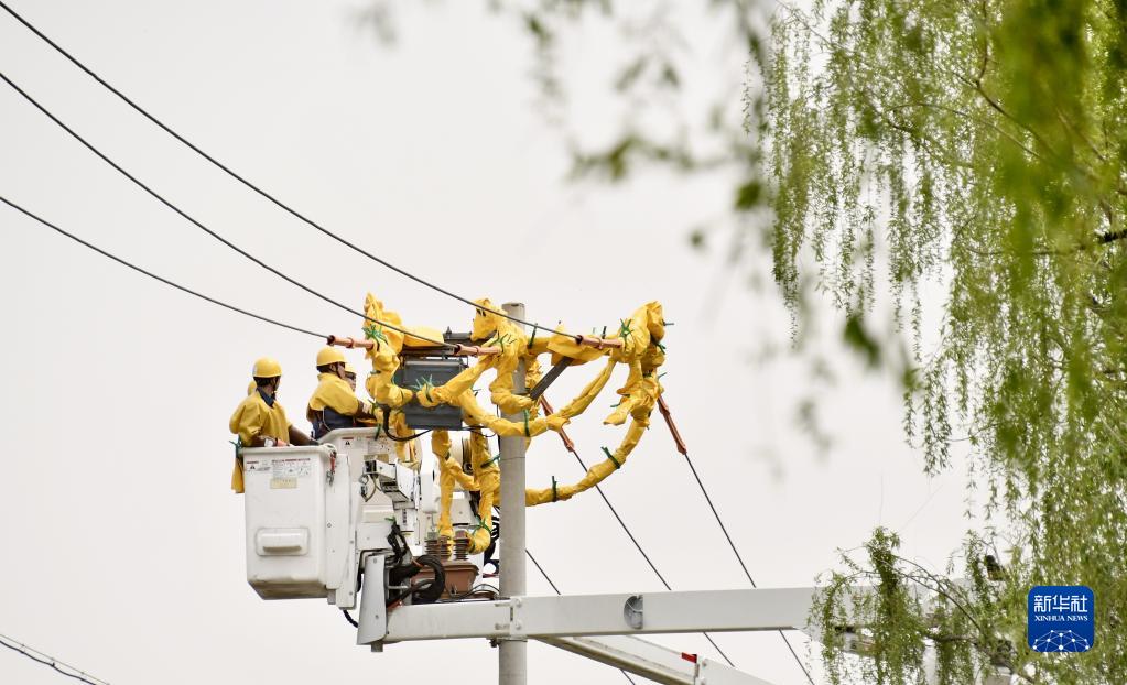 4月13日,工作人員在進(jìn)行配電網(wǎng)帶電檢修工作。