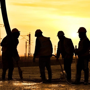 4月13日,工人在包銀高鐵包頭段首座有砟軌道鋼筋混凝土剛構連續梁建設現場(chǎng)作業(yè)(無(wú)人機照片)。