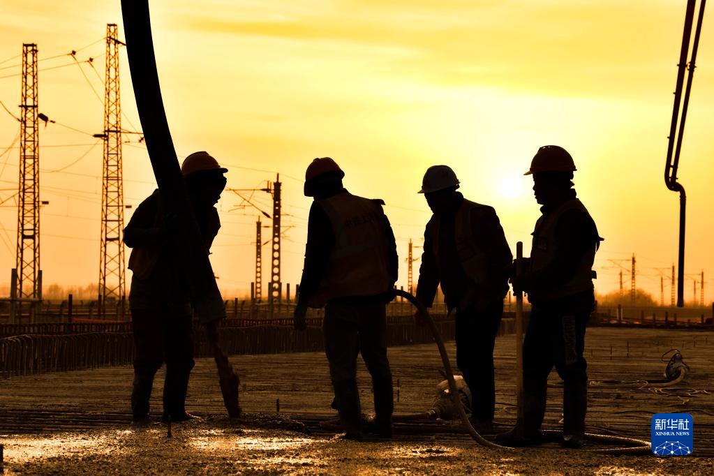 4月13日,工人在包銀高鐵包頭段首座有砟軌道鋼筋混凝土剛構連續梁建設現場(chǎng)作業(yè)。