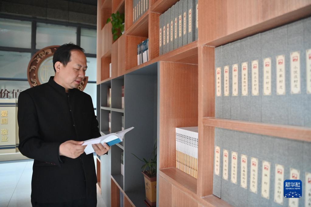 謝連華在天津市西青區檔案館內翻閱村志(4月7日攝)。