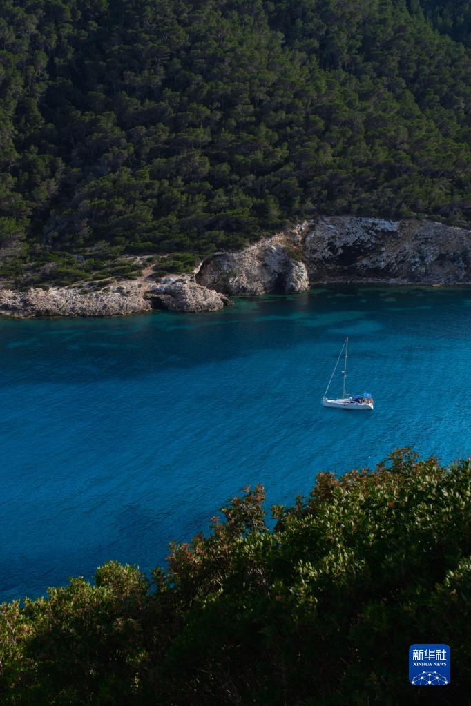 這是4月10日在西班牙巴利阿里群島伊維薩島拍攝的雍加海灣風(fēng)光。