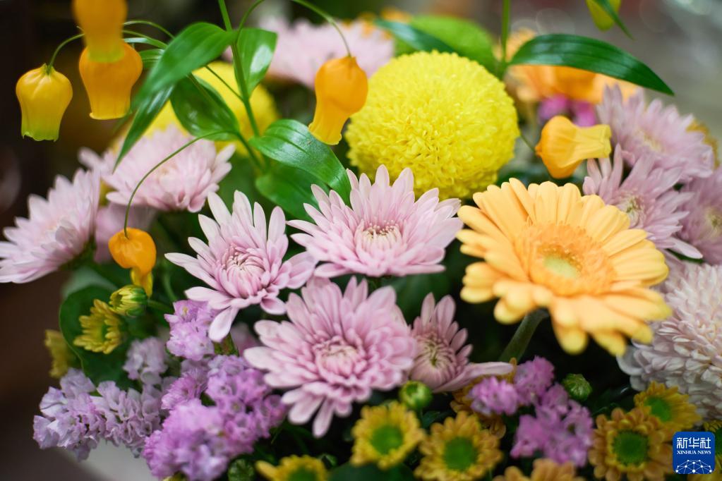 這是在日本千葉縣千葉市一家花店內拍攝的花藍。制作花籃的鮮花部分源自中國云南(4月3日攝)。