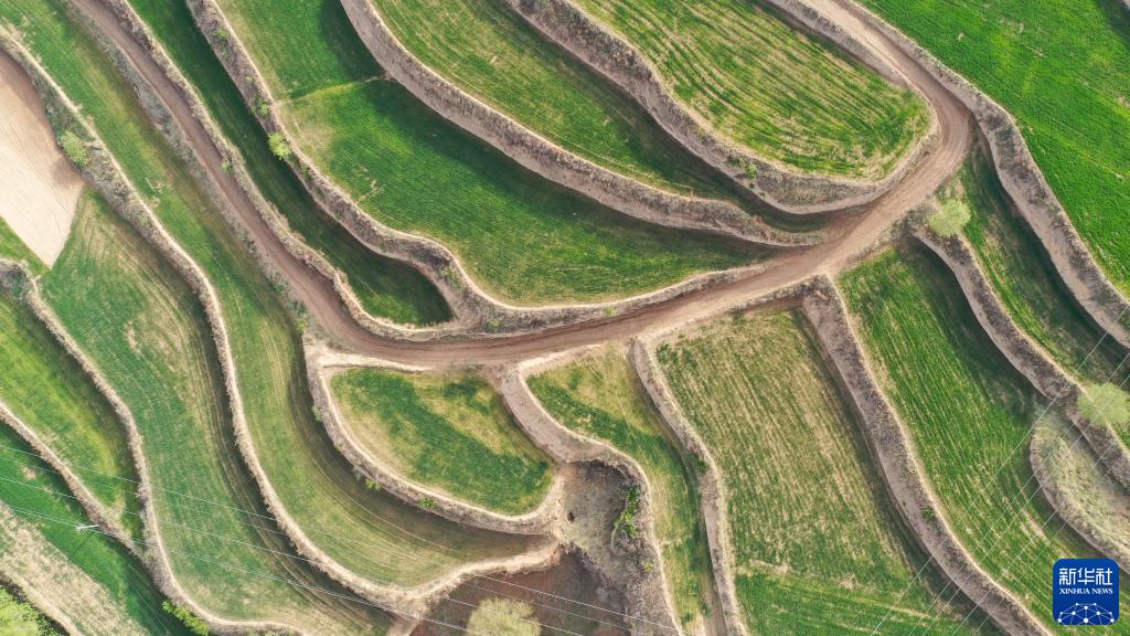 這是4月13日拍攝的甘肅省平?jīng)鍪谐缧趴h錦屏鎮境內的梯田(無(wú)人機照片)。