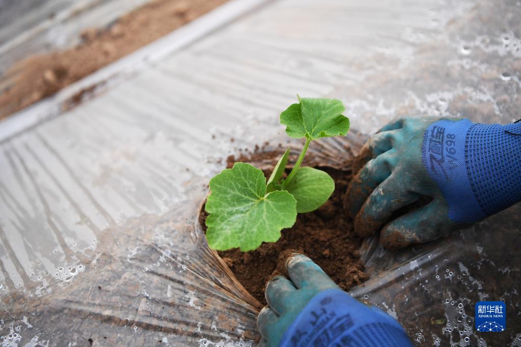 4月13日,在崇信縣錦屏鎮東莊村新豐園蔬菜生產(chǎn)基地的大棚里,農民在栽種蔬菜秧苗。