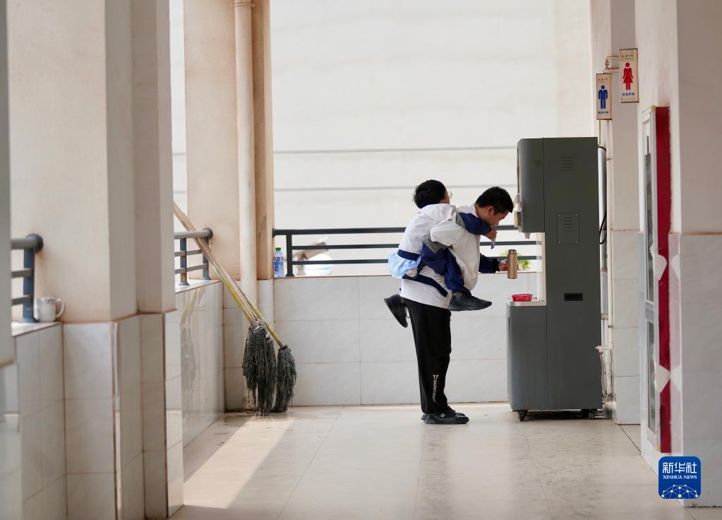 鐘華強患有先天性腦癱,雙腿無(wú)法正常行走。進(jìn)出教室、校園散步、上下樓梯、打水,上體育課……10年時(shí)間,朱金祥一直充當著(zhù)鐘華強的“腿腳”,背著(zhù)他一起長(cháng)大,成績(jì)優(yōu)異的鐘華強在學(xué)習上也常常幫助朱金祥。