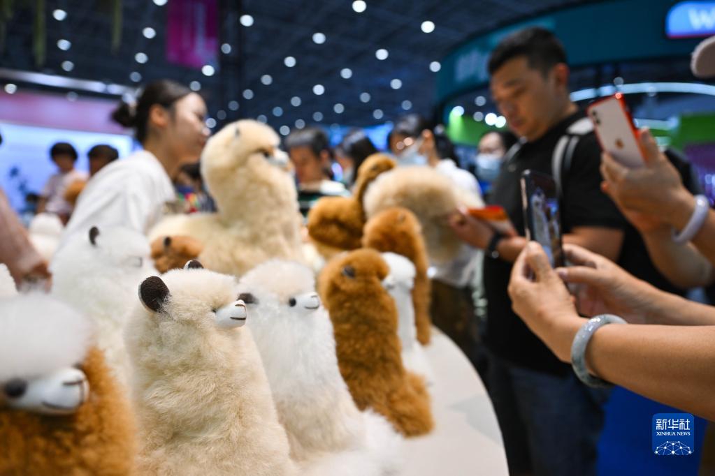 4月14日,觀(guān)眾在消博會(huì )現場(chǎng)選購羊駝絨玩偶。