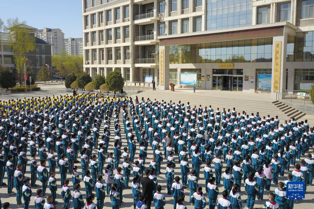 4月14日,在張掖市甘州區大成學(xué)校,學(xué)生們參加全民國家安全教育日國旗下演講(無(wú)人機照片)。