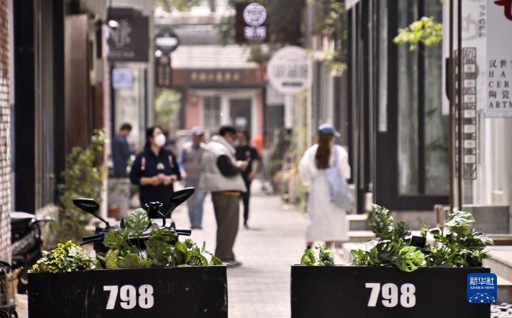 游人在老舊廠(chǎng)區改造的798藝術(shù)區內游覽(4月12日攝)。