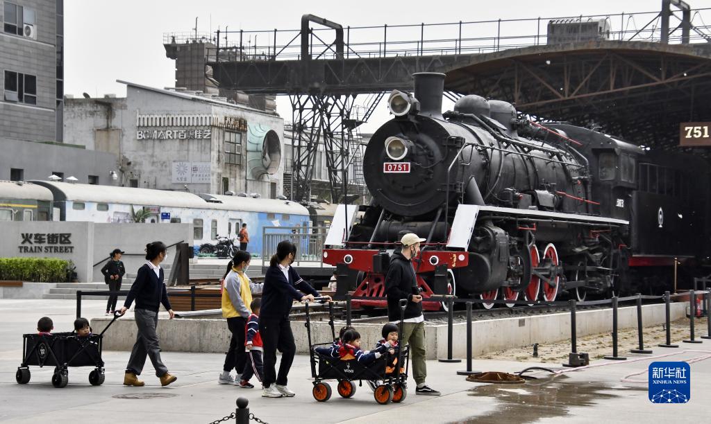 游人在老舊廠(chǎng)區改造的751時(shí)尚設計廣場(chǎng)園區內參觀(guān)工業(yè)遺跡和設施(4月12日攝)。
