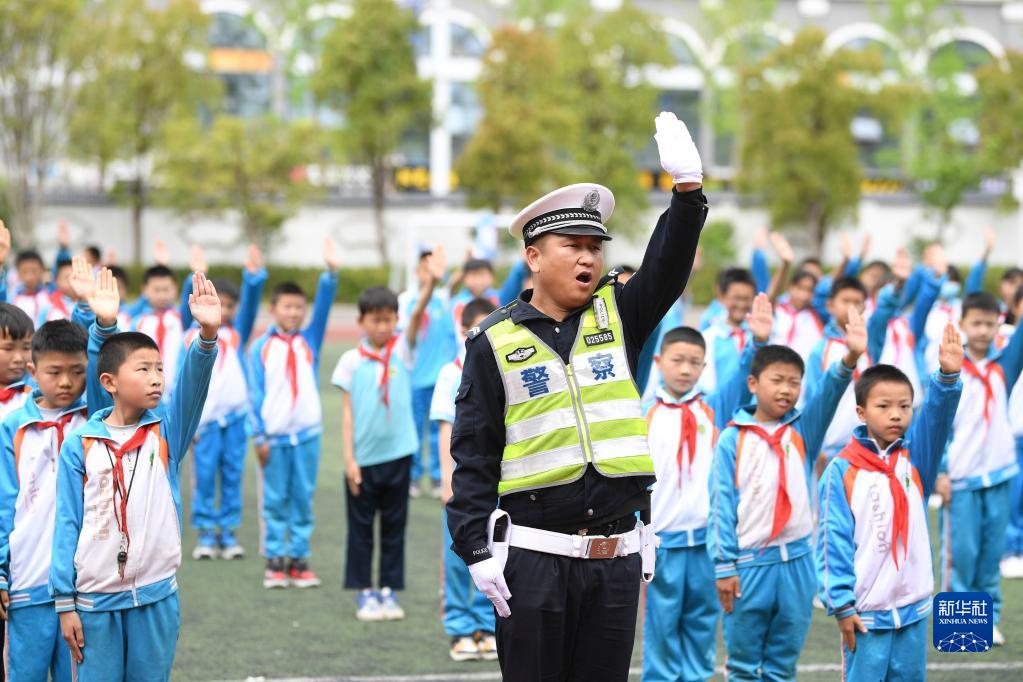 4月14日,民警在貴州省遵義市余慶縣城關(guān)一小帶領(lǐng)學(xué)生們學(xué)習交通指揮手勢。