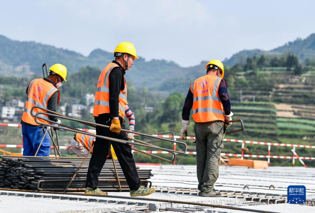 4月11日,工人在貴州德余高速烏江特大橋上施工。