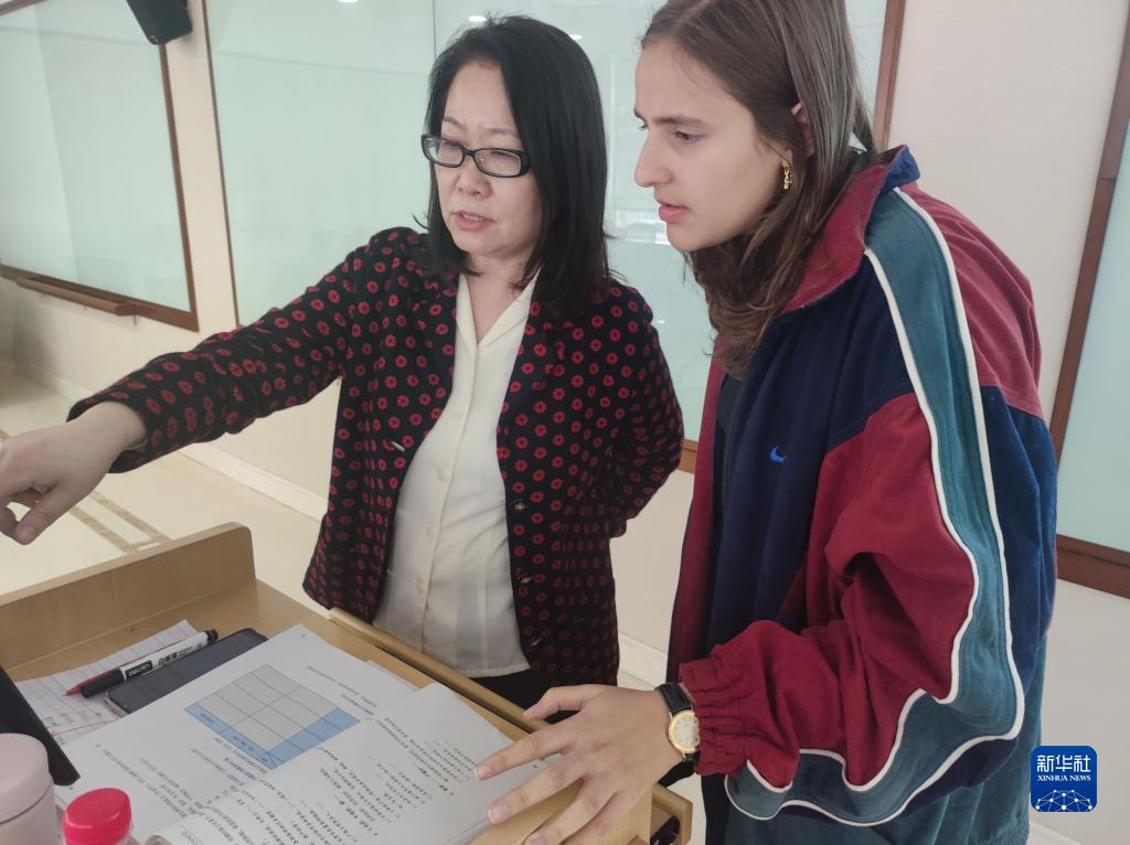 3月31日,在北京大學(xué),微微(右)在中文課后與老師交流(手機照片)。