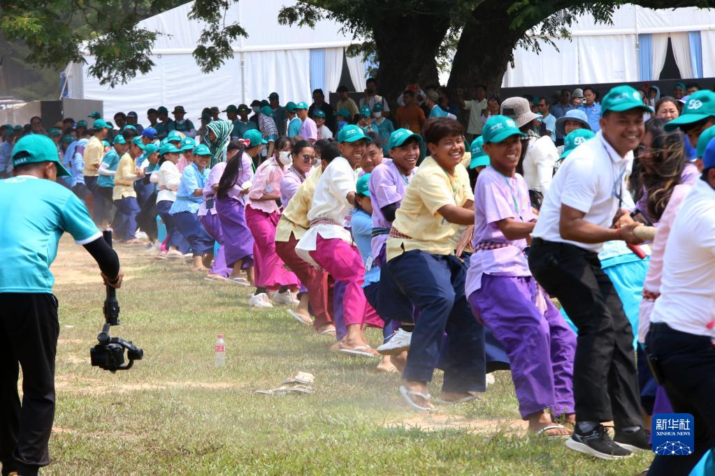 4月14日,在柬埔寨暹粒吳哥古跡內,人們在宋干節慶?;顒?dòng)上參與傳統拔河游戲。