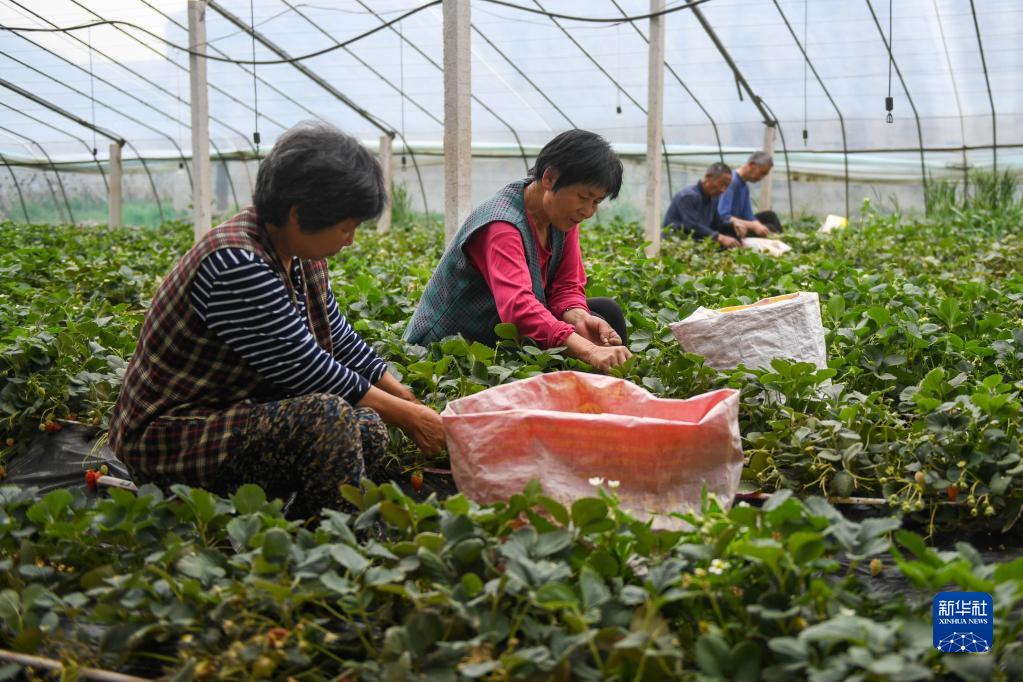 4月14日,山東省泰安市岱岳區范鎮鄭寨子村農業(yè)合作社社員在水果大棚內采摘草莓。