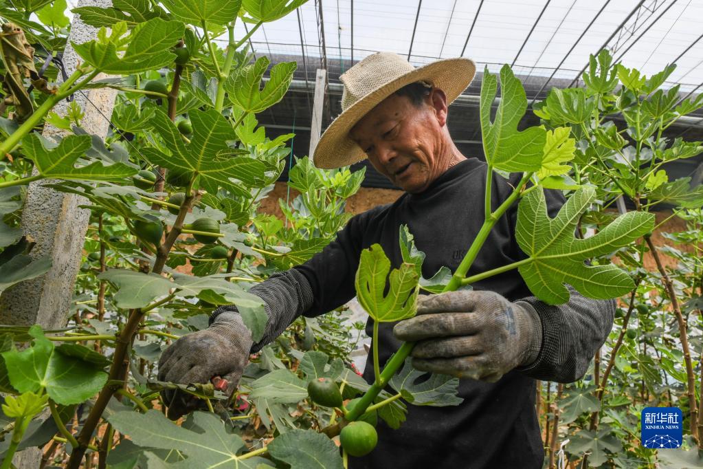 4月14日,山東省泰安市岱岳區范鎮鄭寨子村農業(yè)合作社社員在水果大棚內為無(wú)花果修枝。