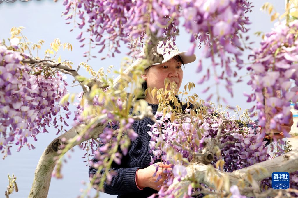 4月15日,一名觀(guān)眾在展區在展出的盆景旁自拍。