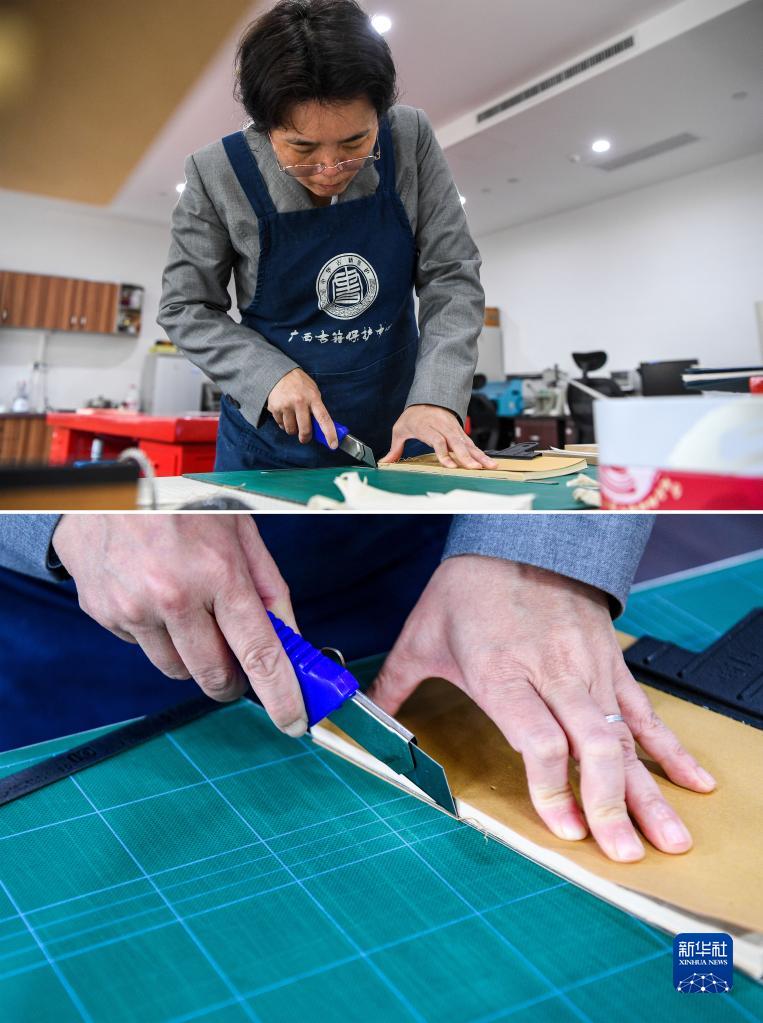 拼版照片:4月14日,在廣西壯族自治區圖書(shū)館古籍保護中心的工作室內,黃玉杏給修補好的古籍裁邊。